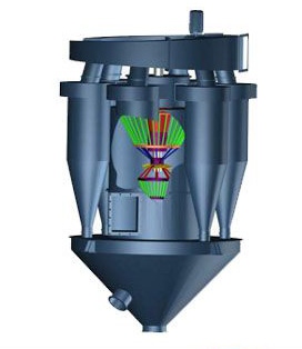 在工作狀態下,高速電機通過傳動裝置帶動立式傳動軸轉動,物料通過設在選粉機室上部的進料口進入選粉室內,再通過設置在中粗粉收集錐的上下兩錐體之間和通粉管道落在撒料盤上,撒料盤隨立式傳動軸轉動,物料在慣性離心力的作用下,向四周均勻撒出,分散的物料在外接風機通過進風口進入選粉室的高速氣流作用下,物料中的粗重顆粒受到慣性離心力的作用被甩向選粉室的內壁面。碰撞后失去動能沿壁面滑下,落到粗粉收錐中,其余的顆粒被旋轉上升的氣流卷起,經過大風葉的作用區時,在大風葉的撞擊下,又有一部分粗粉顆粒被拋到選粉室的內壁面,碰撞后失去動能沿壁面滑下,落到粗粉收集錐中。
